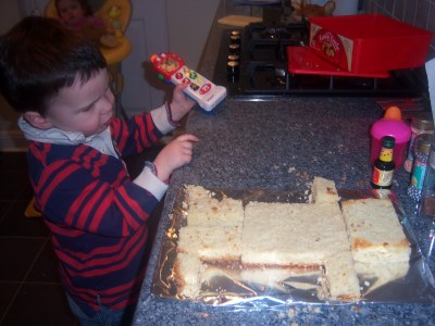It has become quite a tradition now that the day before his birthday party, I go to my mum’s and we do the cake together. We made the robot shape by cutting the sponge into five rectangles for the body and limbs and a square for the head.