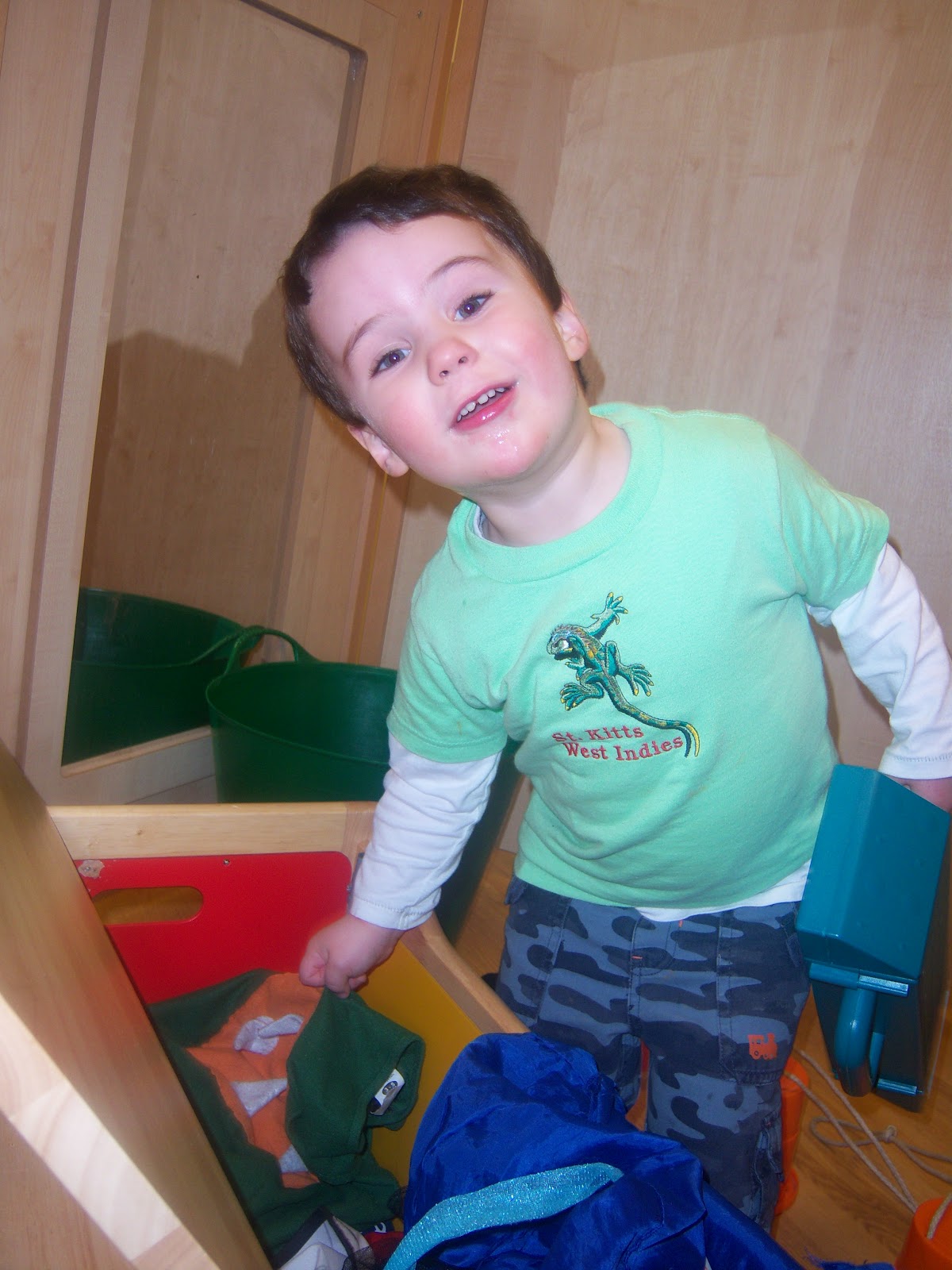 Here is a photo of him exploring the contents of the dressing-up box…