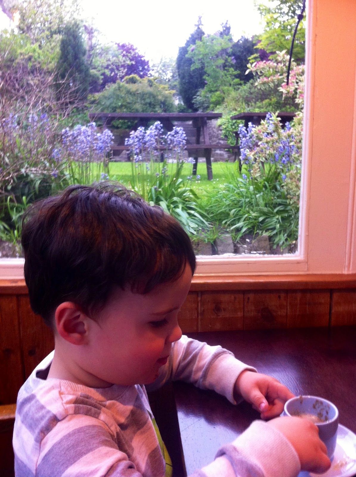 While we waited for our food after ordering, the waitress brought each of us complimentary cream of mushroom soup with toasted bread which I thought was a lovely touch! Here is my son enjoying his soup next to the view of the bluebells from the window…
