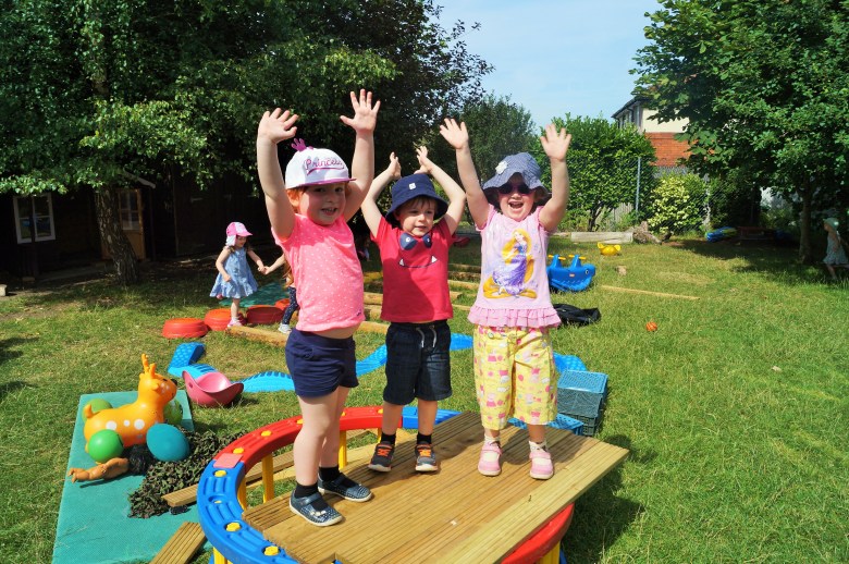 They are encouraged to use their imaginations in role play area. A FABULOUS garden with a sand pit, mud pit, trees to climb up, bushes to hide behind, three wonderful wooden play houses, one of which has two floors, also bikes and scooters to ride on, blocks to build and outside chalks.