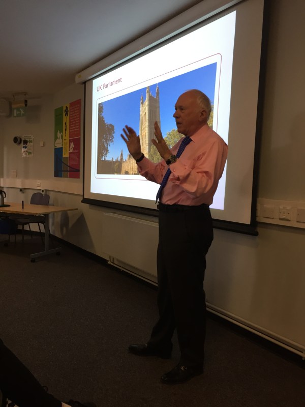 During his 90 minutes at FHS, Lord Rooker explained the differences between House of Commons and House of Lords, what the House of Lords consists of and how people gain their place, the ratio of males/females and the process by which acts are passed through Parliament.